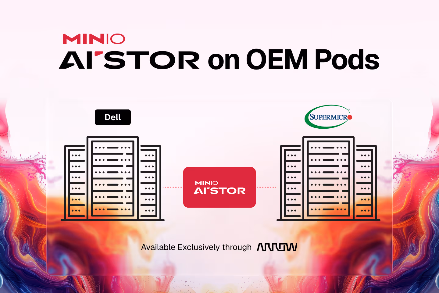 MinIO AIStor runs on certified Dell or Supermicro hardware, delivered as hardened, production-ready pods. Each node is pre-configured and available as a single SKU through Arrow Electronics.