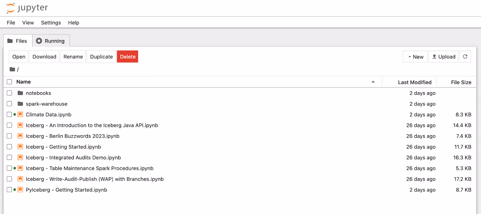 Head on over to the Jupyter Notebook we installed earlier and create a new notebook. We will create a new database and a simple table that has one partition. To create the database put the code below in a cell. This will create a database named `climate.`