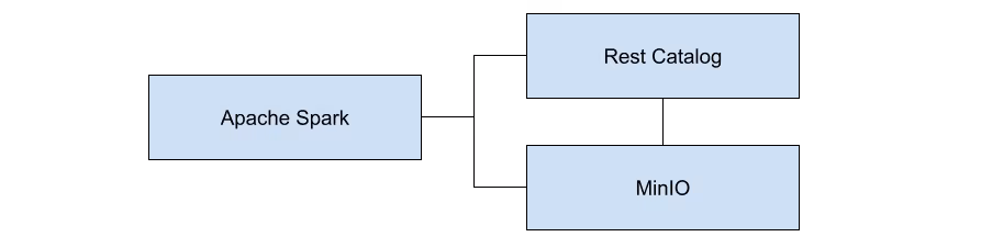 Let’s look at a specific implementation of this logical diagram. The diagram below shows what we will install in this post. The Rest catalog uses MinIO for storing metadata.