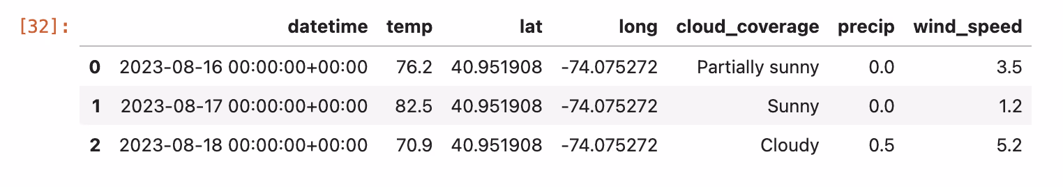 PyIceberg is preinstalled in the Spark service we created via our Docker Compose file. The code below works when dropped into a new cell within our notebook. It will return all rows from the `weather` table that have a `datetime` field greater than or equal to August 1st, 2023.