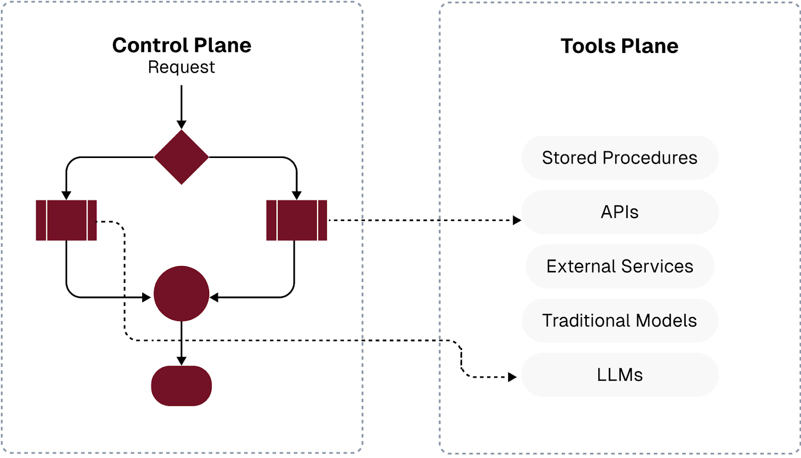The assumption with the tasks above is that the smaller questions can be paired with an internal tool that the controlling LLM is aware of, and the responses (or answers) are accompanied by a certainty grade indicating how confident the tool is in the answer. The process outlined above is commonly broken down into a control plane (the controlling LLM) and a tools plane (the additional tools needed to further educate a controlling LLM for the task at hand). For more information on how this works, check out The Architect’s Guide to Understanding Agentic AI. A logic diagram of the control plane and the tools plane is shown below.