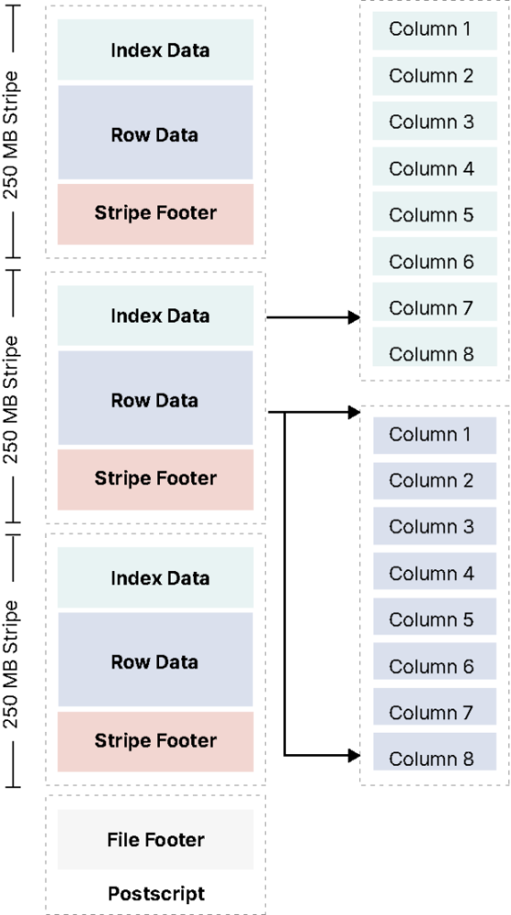 The row data in an ORC file is organized into groups called stripes, which contain a series of rows and metadata about those rows. Each stripe contains a series of rows, and each row is divided into a series of columns. The data for each column is stored separately, which allows ORC to efficiently read only the columns that are needed for a particular query, rather than reading the entire row. ORC also includes metadata about the data, such as data types and compression information, which helps to improve read performance. ORC supports a variety of compression formats, including zlib, LZO and Snappy, which can help to reduce the size of the data on disk and improve read and write performance. It also supports various types of indexes, such as row indexes and bloom filters, which can be used to further improve read performance.