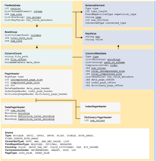 This schema allows for capturing metadata efficiently, enables the evolution of file format and simplifies data storage. Parquet compaction algorithms reduce storage requirements, enable faster retrieval and are supported by many frameworks. There are three types of metadata: file metadata, column (chunk) metadata and page header metadata. Parquet leverages Thrift’s TCompactProtocol for serialization and deserialization of the metadata structures.