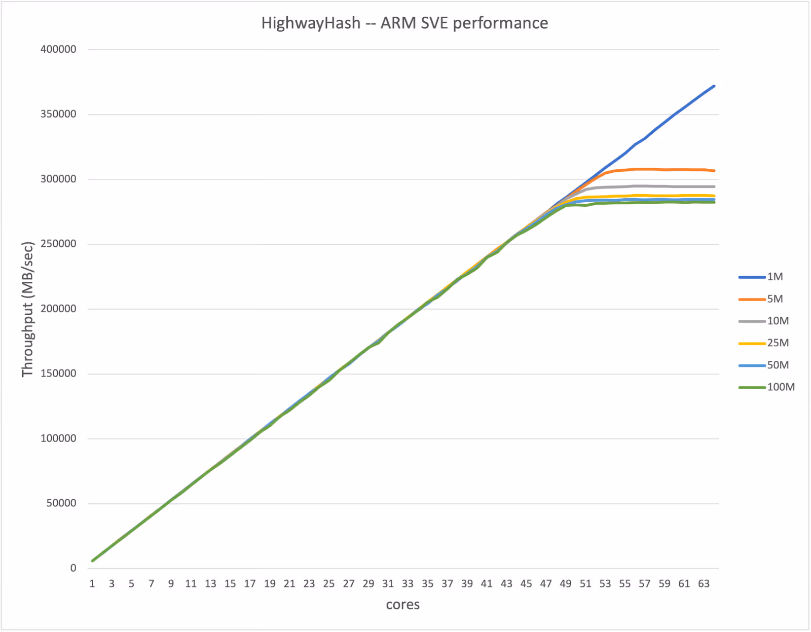 MinIO uses the Highway Hash algorithm for bit-rot detection which is very frequently run both during GET (read) as well as PUT (write) operations. Here too, we added SVE support for the core hashing update function with the following result: