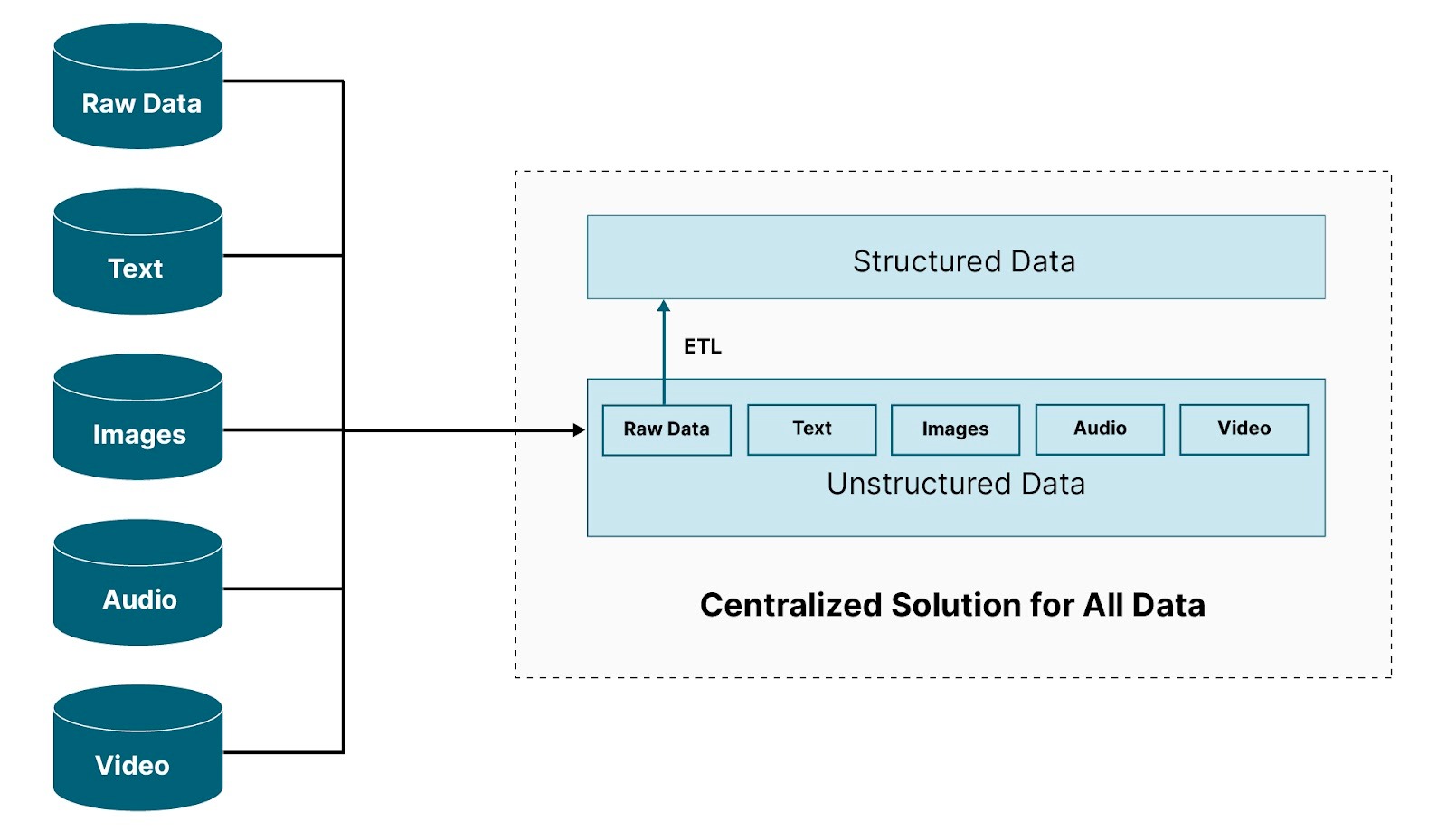 The diagram below depicts a common problem and a hypothetical solution. Data is coming into a data center from multiple locations and in multiple formats. What is needed is a centralized solution that allows raw data to be transformed such that a processing engine can efficiently support business intelligence, data analytics, and machine learning. At the same time, this solution must also be capable of storing unstructured data (text, images, audio, and video) for data exploration and machine learning. It should also keep any data that was transformed in its original format in case a transformation needs to be replayed or a data integrity issue needs to be investigated.