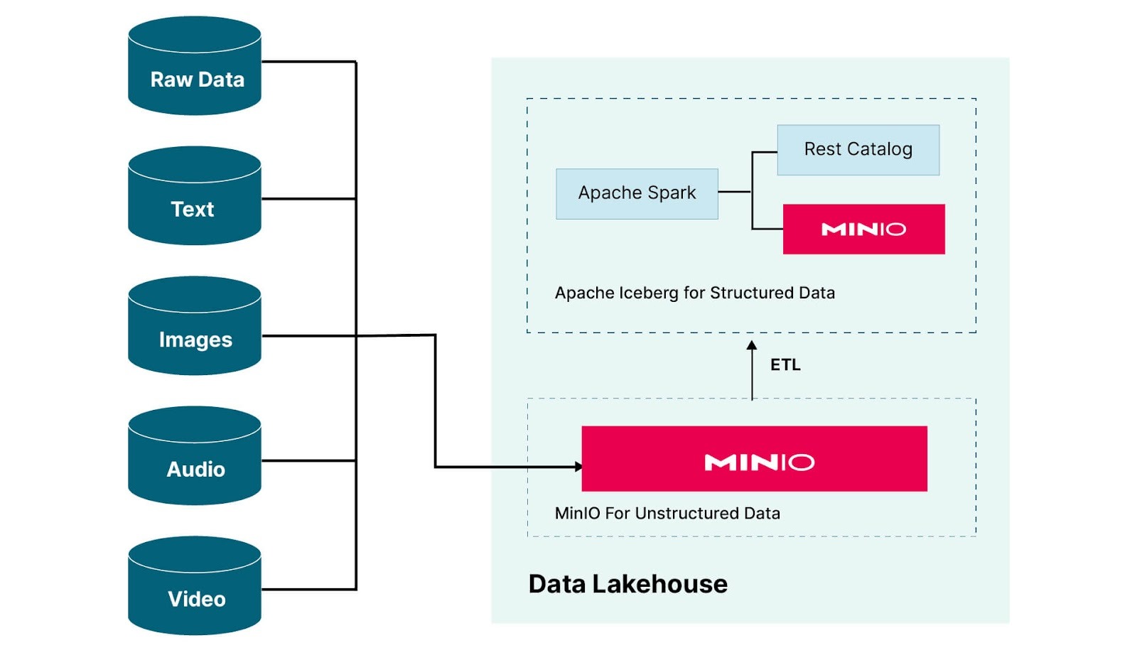 There are two logical components to our Data Lakehouse. The first is an implementation of Apache Iceberg for structured data - the equivalent of a Data Warehouse. (This is what I built out in my previous post - so I will not go into detail here.) The second logical component is MinIO for unstructured data - the Data Lake side of our Data Lakehouse. All data coming into the Lakehouse is delivered to this logical instance of MinIO. In reality, the two logical instances of MinIO shown above could be the same instance of MinIO in your data center. If the cluster you are running MinIO in can handle the ingestion of all incoming data and the processing requirements of Apache Iceberg, then such a deployment will save money. This is, in fact, what I will do in this post. I’ll use a bucket within Apache Iceberg’s instance of MinIO to hold all unstructured and raw data.