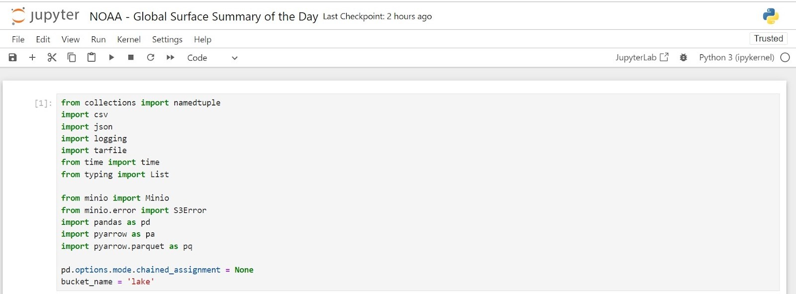 Notice that we are importing the MinIO library. The notebook we are building is an ETL pipeline from unstructured storage (MinIO Data Lake) to structured storage (Apache Iceberg, which uses MinIO under the hood.) The start of your notebook should look like this.