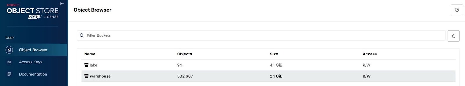 The dataset we will experiment with in this post is a public dataset known as the Global Surface Summary of the Day (GSOD), which is managed by the National Oceanic and Atmospheric Administration (NOAA). NOAA currently maintains data from over 9000 stations around the world and the GSOD dataset contains summary information per day from these stations. You can download the data here. There is one gzip file per year. It starts in 1929 and ends in 2022 (at the time of this writing). To build our Data Lakehouse, I downloaded every year’s file and put it in the MinIO instance being used for our Data Lakehouse. I put all files in a bucket named `lake.` The two buckets within our instance of MinIO are shown below. The `warehouse` bucket was created when we installed Apache Iceberg.