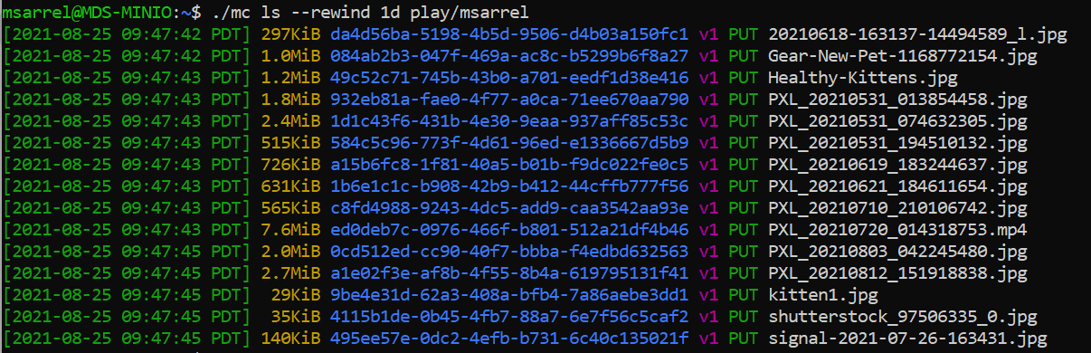 Now I’ll copy my kitten photos to the versioned bucket on play with ./mc cp /mnt/c/Documents\ and\ Settings/msarr/Downloads/kittens/*.* play/msarrel and I can see the files are copied to my bucket on play: