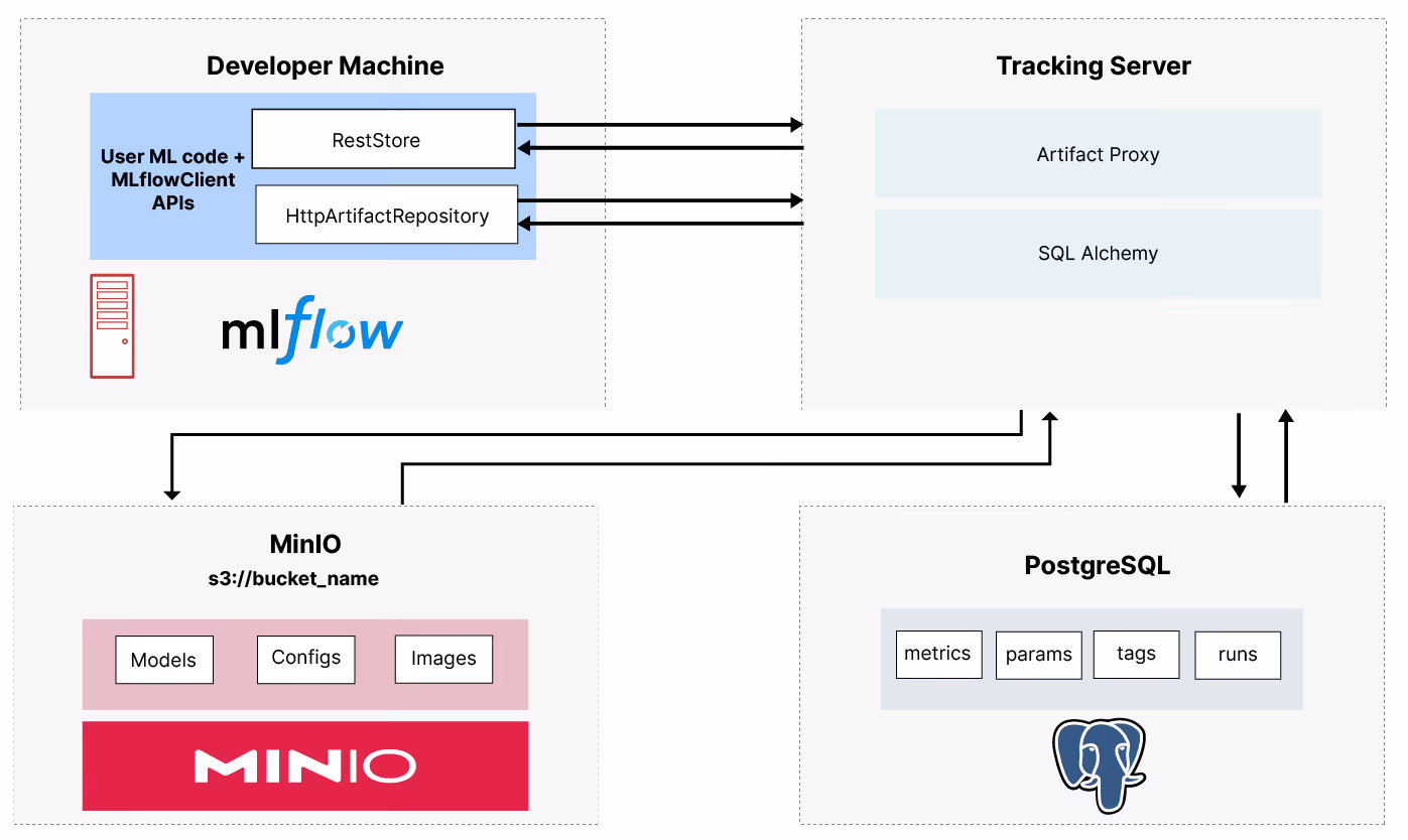 Check out Setting up a Development Machine with MLFlow and MinIO to get MLflow set up on your development machine. This post provides some background on MLflow, describes the products it uses under the hood (PostgreSQL and MinIO), and finally shows how to create and load a docker-compose file for local emulation. The diagram below shows the relationship between the MLflow tracking server, PostreSQLm and MinIO.