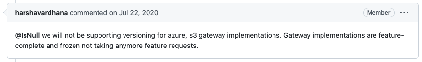 Second, the S3 API has evolved considerably since we started, and what began as inline translation morphed into something much more. Critical S3 capabilities like versioning, bucket replication, immutability/object locking, s3-select, encryption, and compression couldn’t be supported in the gateway mode without introducing a proprietary backend format. It would defeat the purpose of the gateway mode because the backend could no longer be read directly without the help of the gateway service. The backends would merely act as storage media for the gateway and you might as well run MinIO in server mode. Thus it became a compromise that MinIO no longer wanted to engage in. This meant it was time for us to let go.
