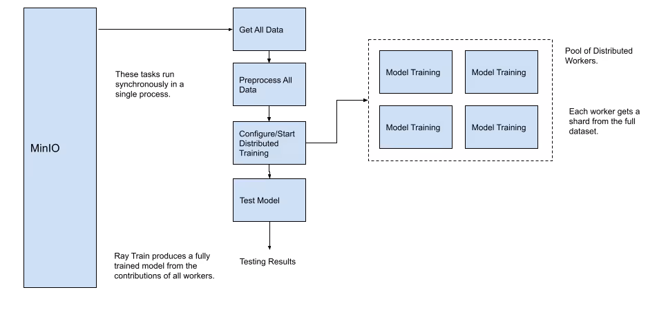 In this post, I will show how to build and test the distributed data processing shown in the diagram from the previous section. Specifically, I’ll show how to get a list of object pointers from MinIO and set up the data for distributed processing. To do this, I will use Ray Data and MinIO. Ray Data is a data processing library for distributed machine learning workloads. In my next post, I will show how to use what we built in this post to complete the implementation of our fully distributed diagram by using Ray Train with MinIO.