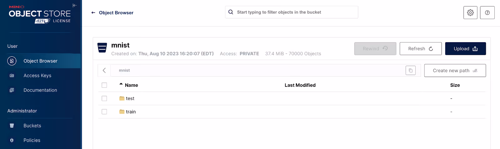 The dataset I will use for this post is the Modified National Institute of Standards and Technology (MNIST) dataset. It is a collection of handwritten digits. It is one of the most well-known datasets in the ML community, and it is commonly used as an introduction to building neural networks. Each image is a 28 x 28 pixel image of a handwritten number between 0 and 9. There are 60,000 images for training and 10,000 for testing. The code download for this post contains a script that can be used to upload these images to MinIO. Once uploaded, there will be an ‘mnist’ bucket with test images and training images as shown below.