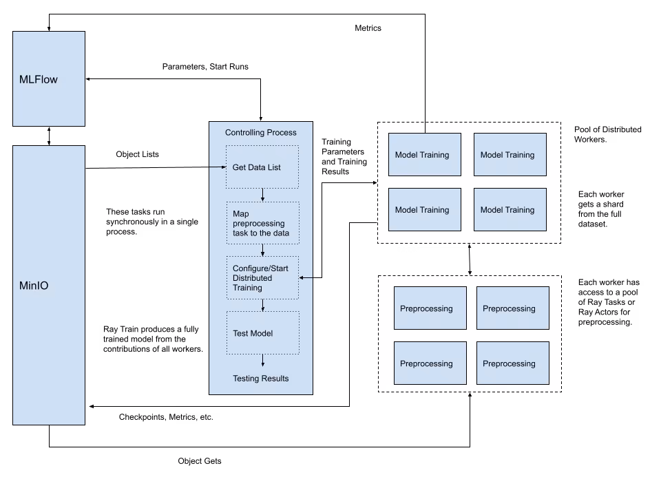 The diagram below is a visualization of how distributed training, distributed preprocessing and MLflow fit together. This is the diagram I presented in my Ray Train post with MLFlow added. It represents a really good start to building a foundation for all your AI initiatives: MinIO for high-speed object storage, Ray for distributed training and data processing, and MLFlow for MLOPs.