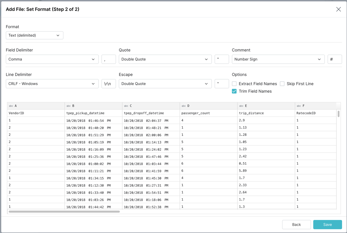 Dremio will automatically parse the CSV and provide the recommended formatting as shown below, click Save to proceed.