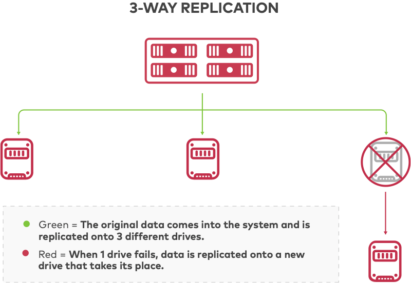 Many distributed systems use 3-way replication for data protection, where the original data is written in full to 3 different drives and any one drive is able to repair or read the original data. Not only is replication inefficient in terms of storage utilization, it is also operationally inefficient when it recovers from failure. When a drive fails, the system will place itself in read-only mode at reduced performance while it fully copies an intact drive onto a new drive to replace the failed drive.