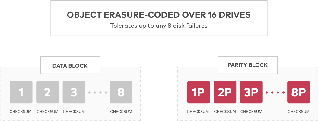 MinIO uses Reed-Solomon code to stripe objects into data and parity blocks that can be configured to any desired redundancy level. This means that in a 16 drive setup with 8 parity configuration, an object is striped across as 8 data and 8 parity blocks. Even if you lose as many as 7 ((n/2)–1) drives, be it parity or data, you can still reconstruct the data reliably from the remaining drives. MinIO’s implementation ensures that objects can be read or new objects written even if multiple devices are lost or unavailable.