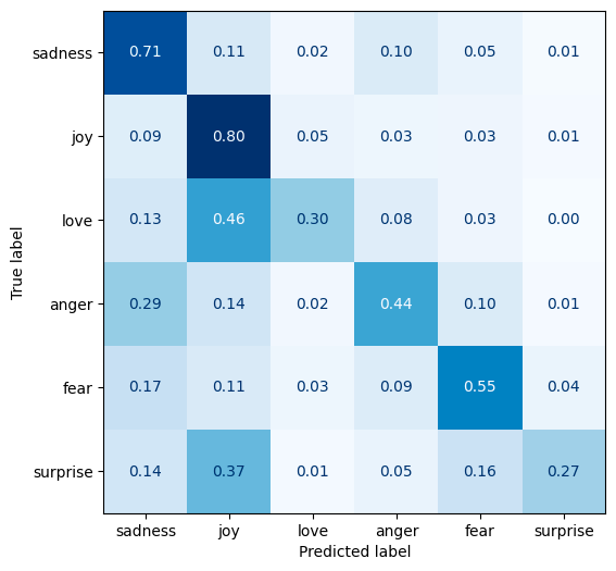 As we can see from our confusion matrix, the results are better than the score would lead us to believe. Surprise is often predicted as joy. Love is also predicted as joy. Finally, anger is often confused with sadness. These mistakes are actually near misses. We can also see that anger and love are rarely confused with each other.