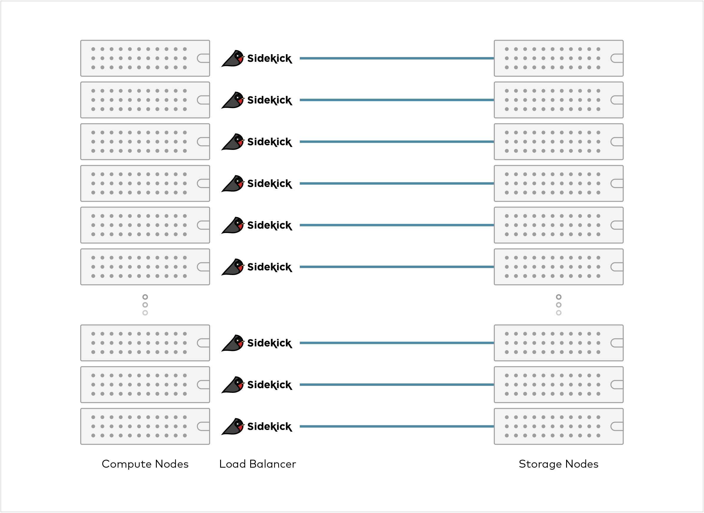 Sidekick solves the network bottleneck by taking a sidecar approach instead. It runs as a tiny sidecar process alongside of each of the client applications. This way, the applications can communicate directly with the servers without an extra physical hop. Since each of the clients run their own sidekick in a share-nothing model, you can scale the load balancer to any number of clients.