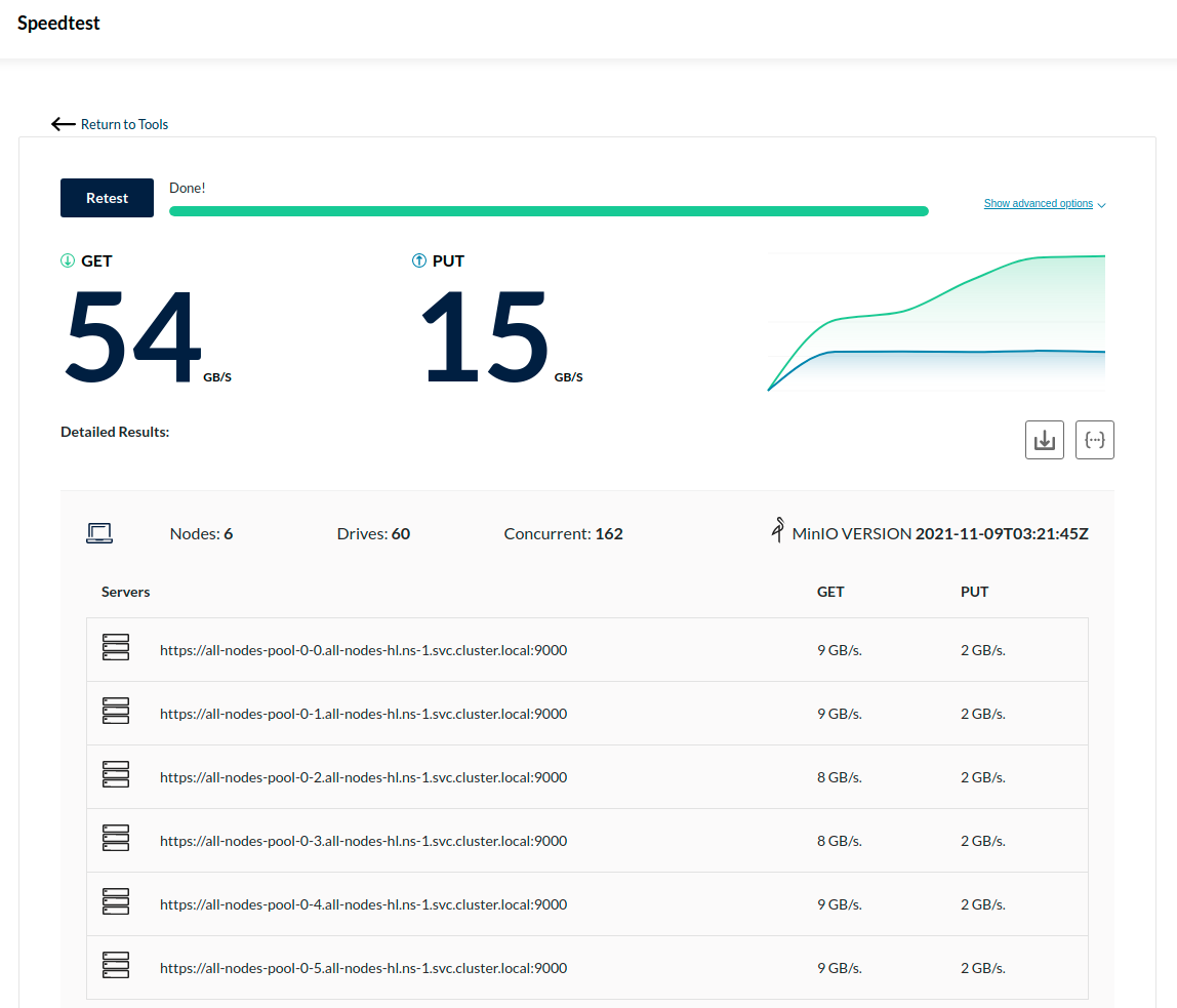 Click Start to run a test, or click Show advanced settings to customize the duration, object size and number of concurrent requests and then click Start.