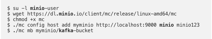3. Install minio-client & create a bucket : Follow the link to get started with minio client https://docs.min.io/docs/minio-client-quickstart-guide.html