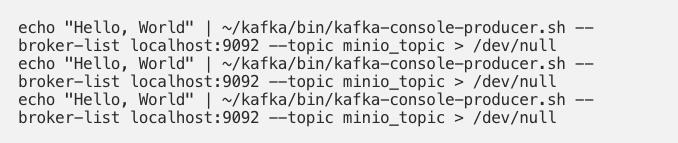 9. Publish data to Kafka topic : Since the flush size defined in s3-sink.properties is set to 3, plugin would flush the data to MinIO once there are three messages in the topic minio_topic.