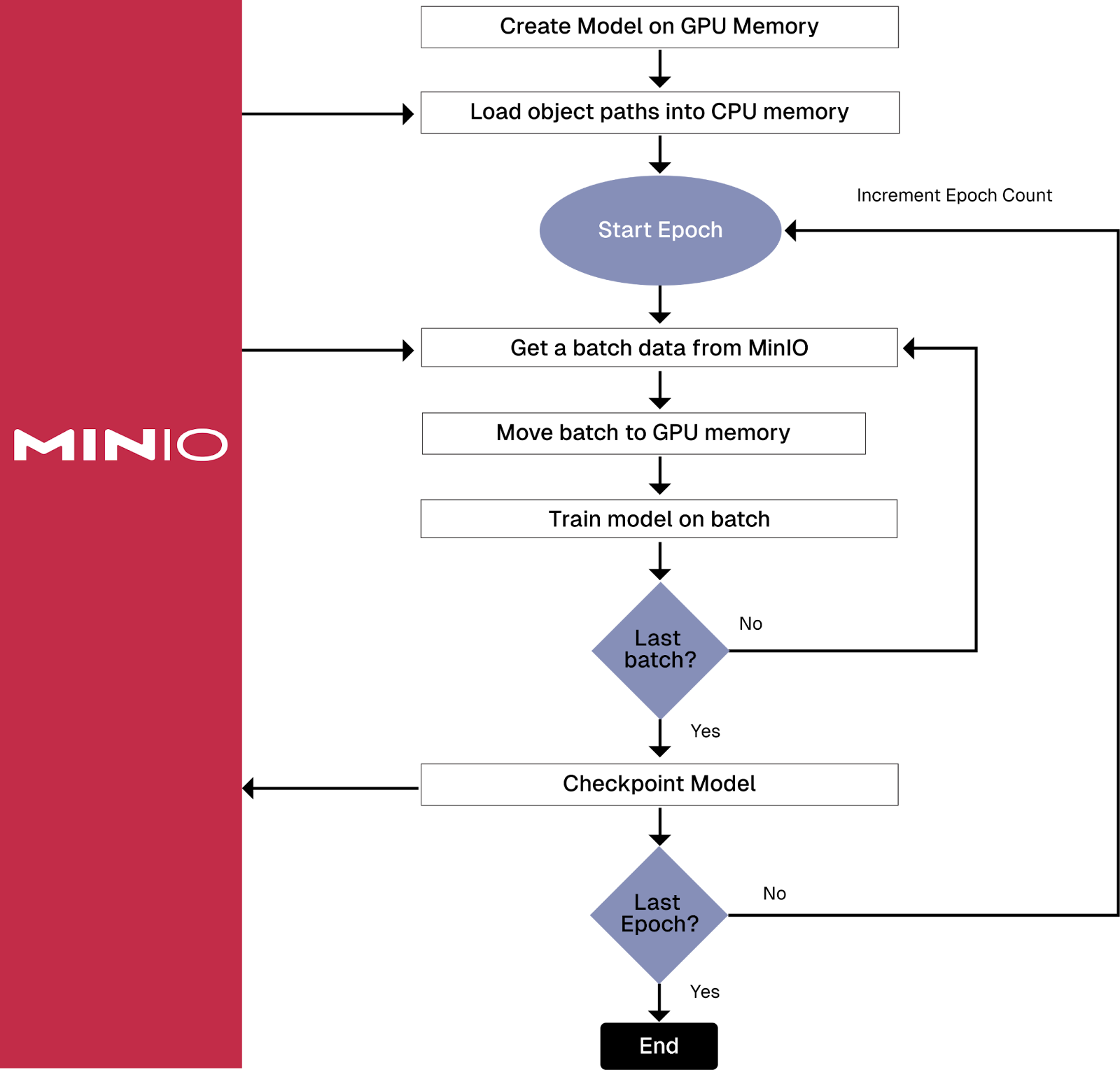 A map-style dataset is created by implementing a class that overrides the __getitem__() and __len__() methods in PyTorch’s Dataset base class. Once instantiated, individual samples are mapped to an index or key. The code below shows how to override these methods. It uses the MinIO SDK to manually retrieve an object stored and apply a transformation to it. The full code download can be found here.