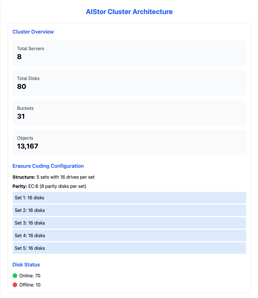 When we want to get admin information about the cluster, we run mc admin commands. Usually, they give you a list of nodes and disks with information about their health and utilization. What if we ask LLM the same question?