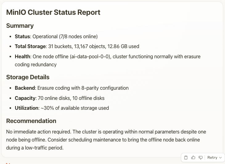 Experienced MinIO system administrators are not afraid of the command line. They can easily use the mc admin commands to manage their clusters. What could using LLM and MCP servers add to their experience? LLMs are great at summarizing large amounts of information and can be used to format the information we get from the cluster in a human-readable way.