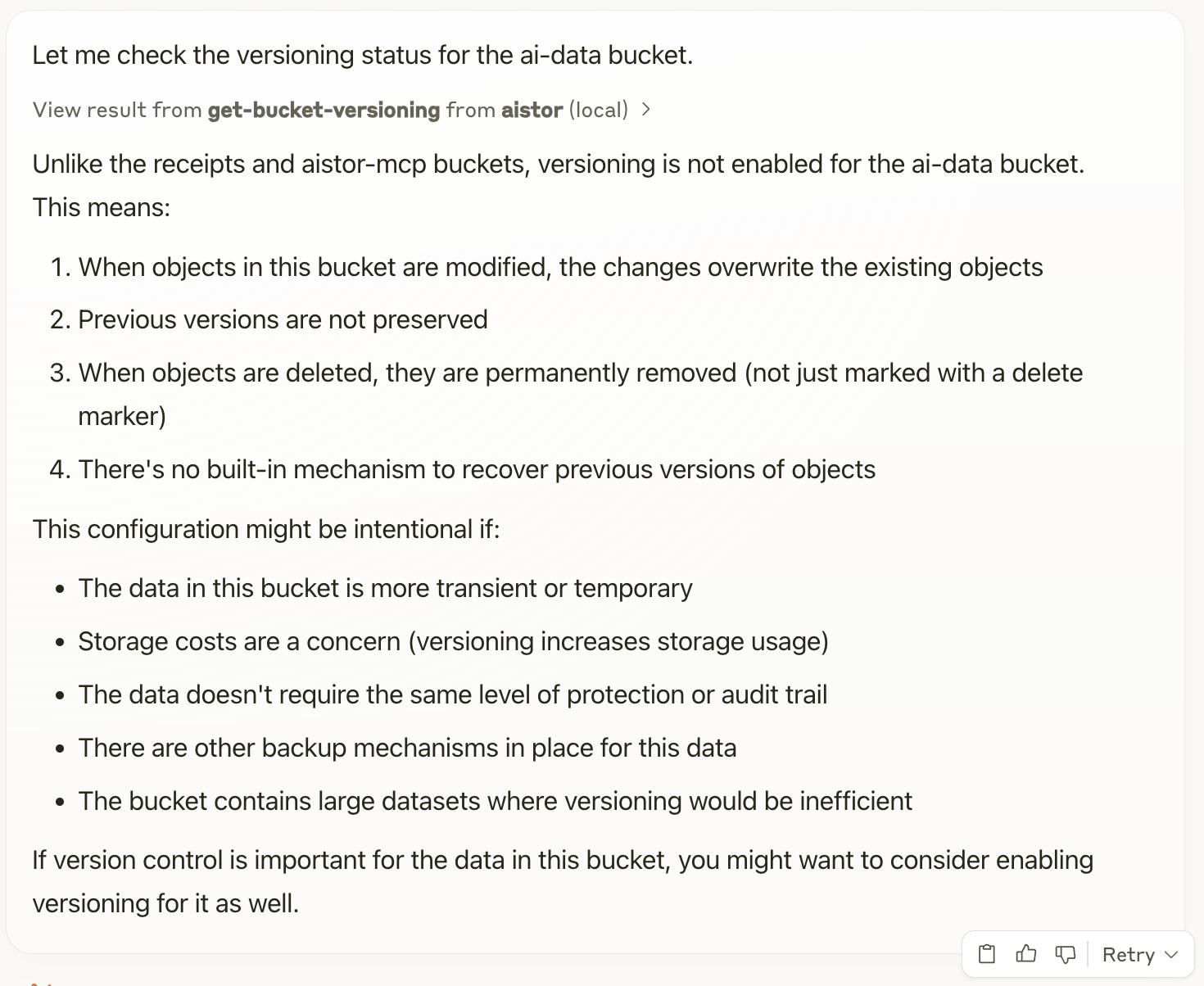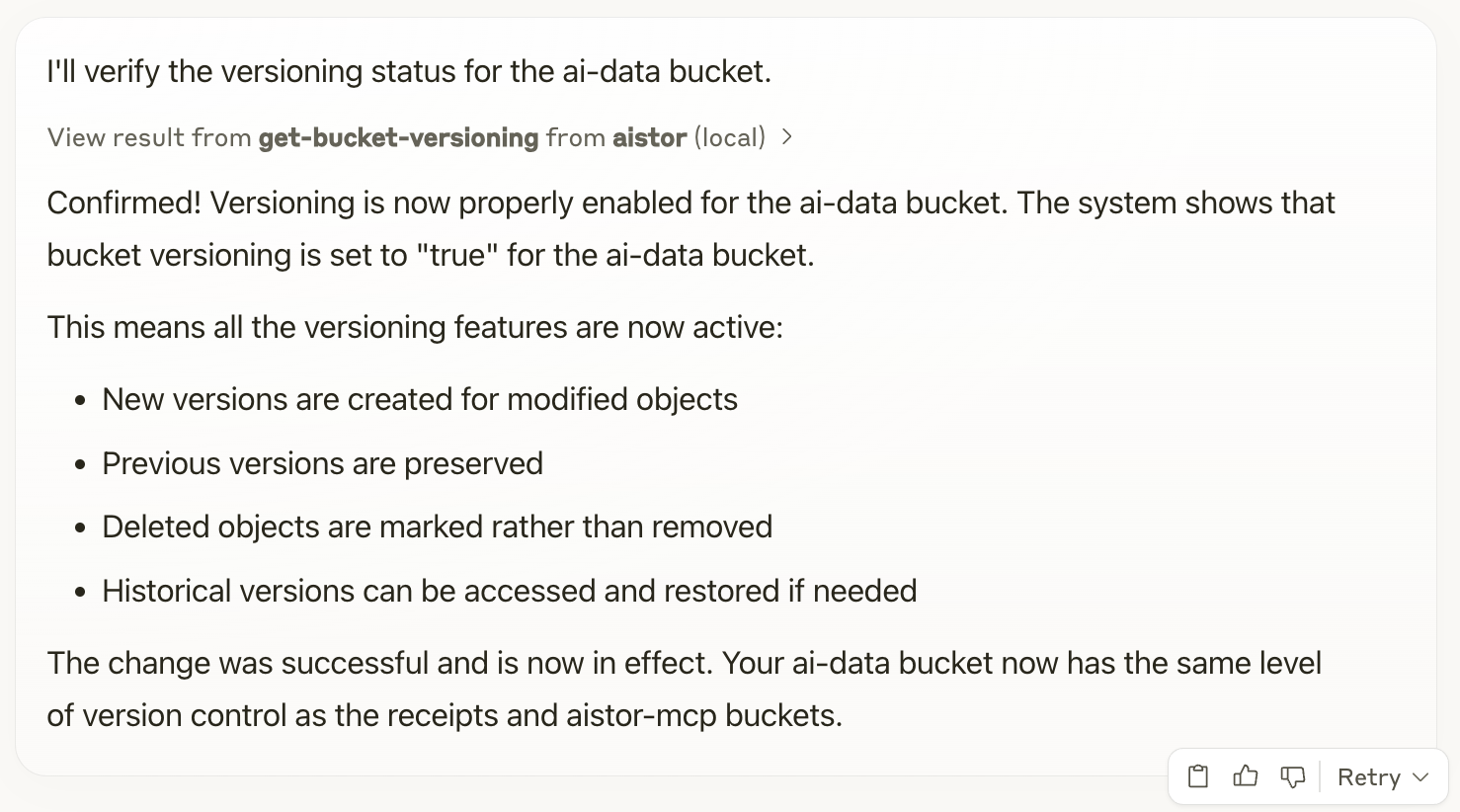We didn’t specify which bucket we wanted to enable versioning on, but Claude remembered the conversation’s context and took the right action.