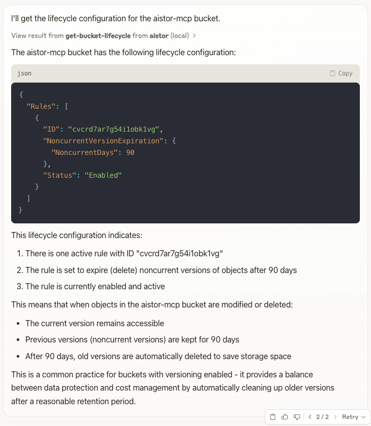 You can also use human language requests to get information about the lifecycle management configuration, such as rules for keeping versions of an object and deletion restrictions.