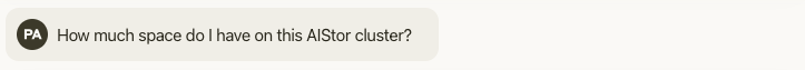 Besides the health status, let’s ask about available space and overall data distribution. Of course, you can get this information by analyzing the output of the mc admin info --json command, but maybe LLM can do it too?