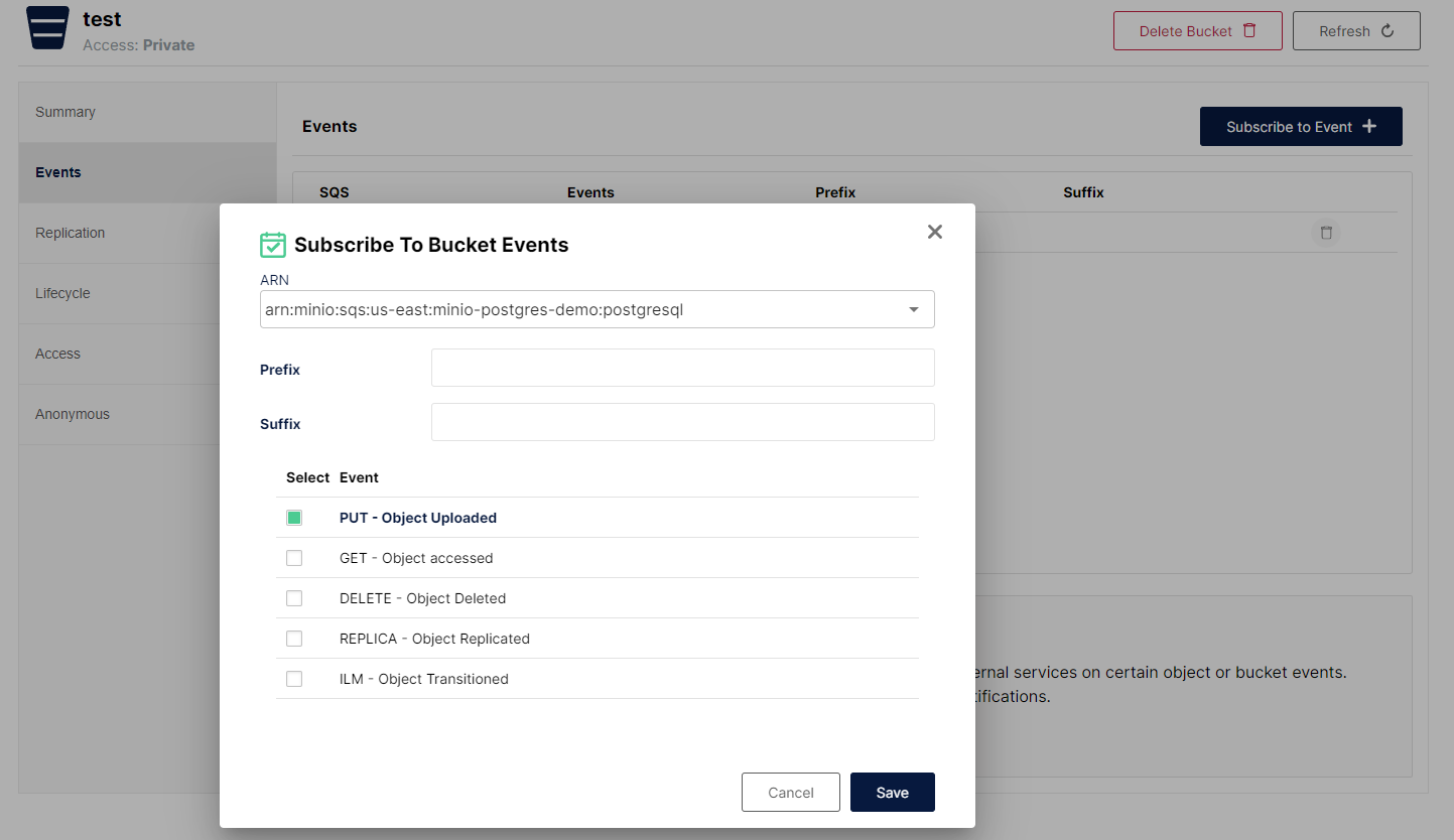 Once our Bucket Event has been successfully created we can proceed to the bucket for which we are subscribing to the events. The following screenshot subscribes a bucket named “test” to the “minio-postgres-demo” event, which will be targeted at our PostgreSQL deployment. Here you can specify any prefix or suffix as well select which type of event you want to subscribe to.