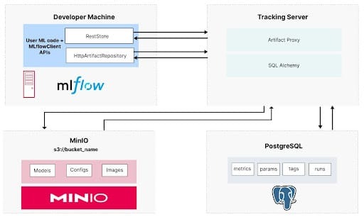 I’ll assume you already have MLflow installed on your development machine as a remote server using PostgreSQL and MinIO. If you do not have MLflow installed, check out my post on Setting up a Development Machine with MLflow and MinIO, where I showed how to use Docker Compose to run the services shown below.