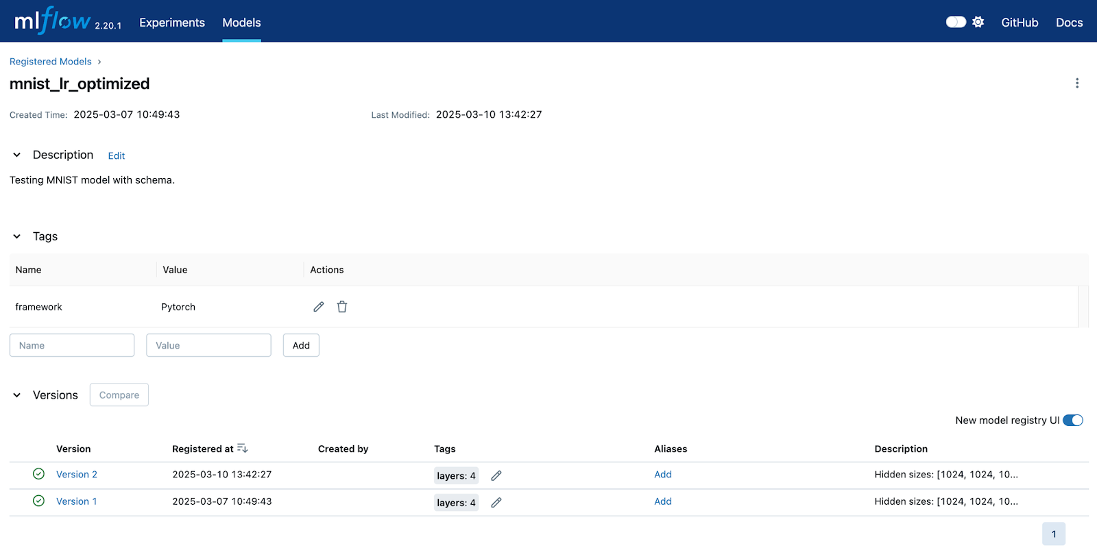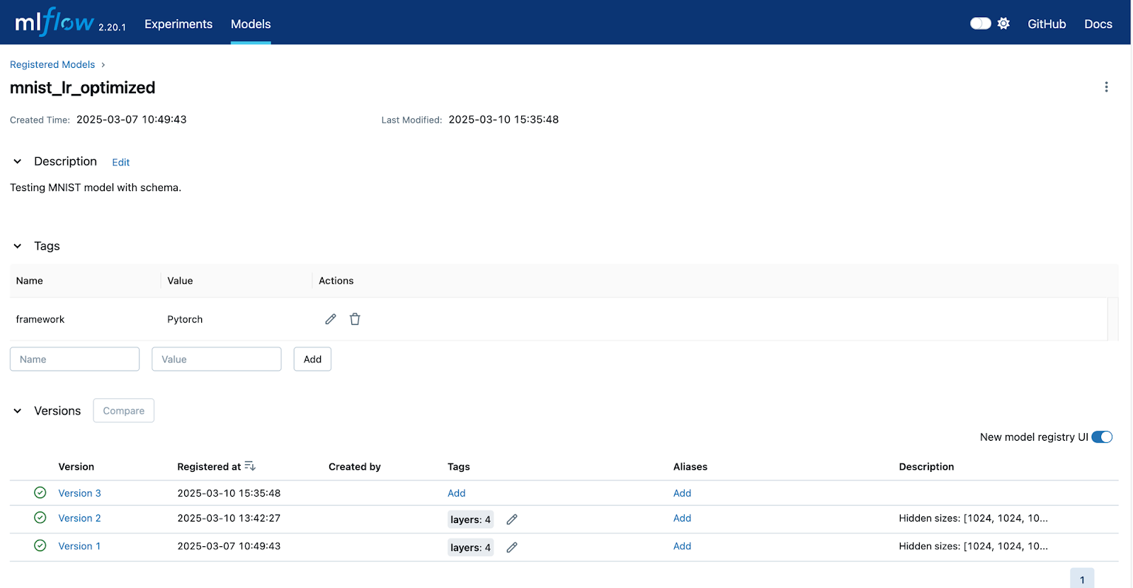 Click on your model to see the list of versions for this model. This is shown below. Also, notice that there are descriptions and tags at the collection level.