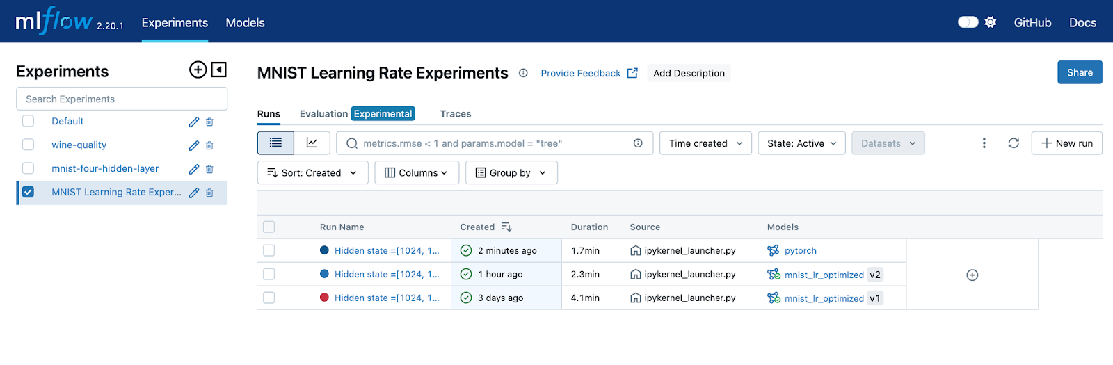 Once you have registered several versions of a model, you will be able to view them in the UI. Let’s look at the Model Registry in the MLflow UI. Start the UI by navigating to http://localhost:5000/. The default view will show you all your experiments. We want to look at registered models, so find the Models tab at the top of the page and click it. You will see a list of all models that have been registered. An example is shown below.