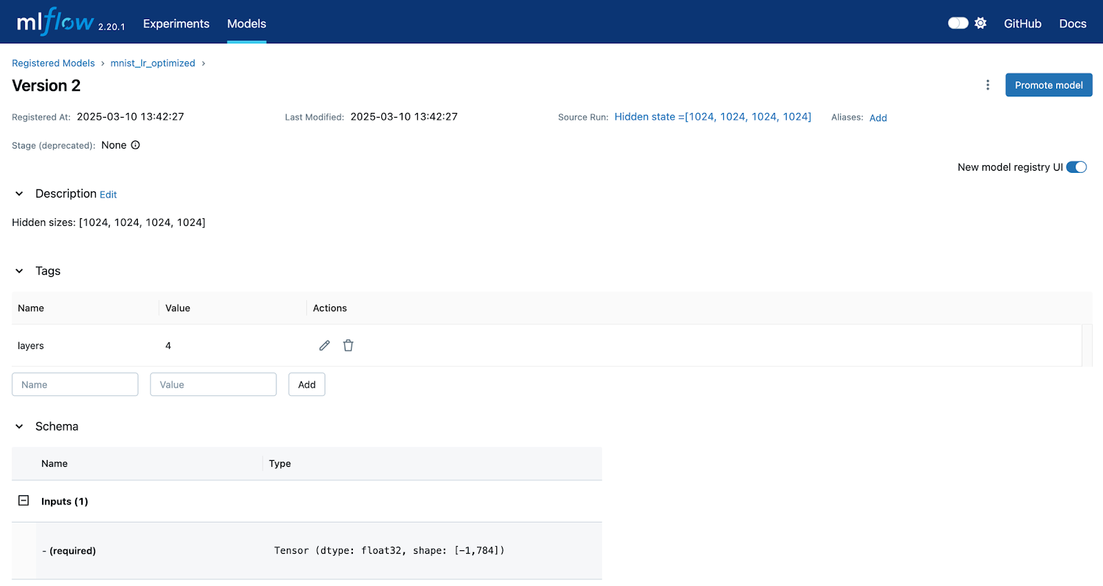 The version has its own description and tags. You can edit these values using this page and you can also set the stage of the model. Also, review the schema of this model. This will come into play when we load the model and perform tests on it, which we will do in the next section.