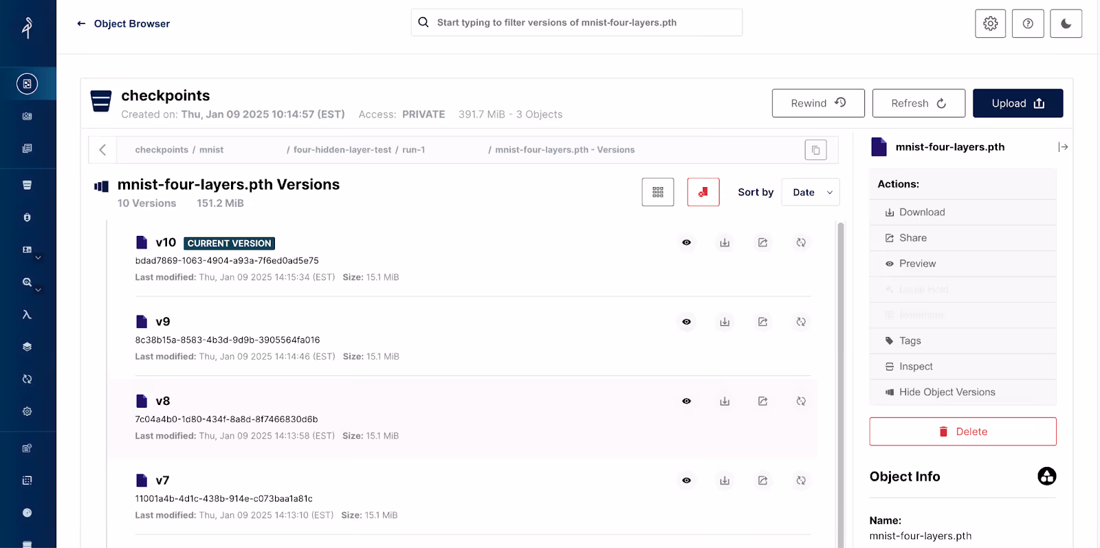 Notice that the model name does not contain a substring indicating the epoch. As stated previously, I used a bucket with versioning enabled - in other words, the version number indicates the epoch. What is nice about this approach is that you do not need to know the number of epochs to reference the most recent model. Once the above training code runs for a run of ten epochs my checkpoint bucket looked like the screenshot below.