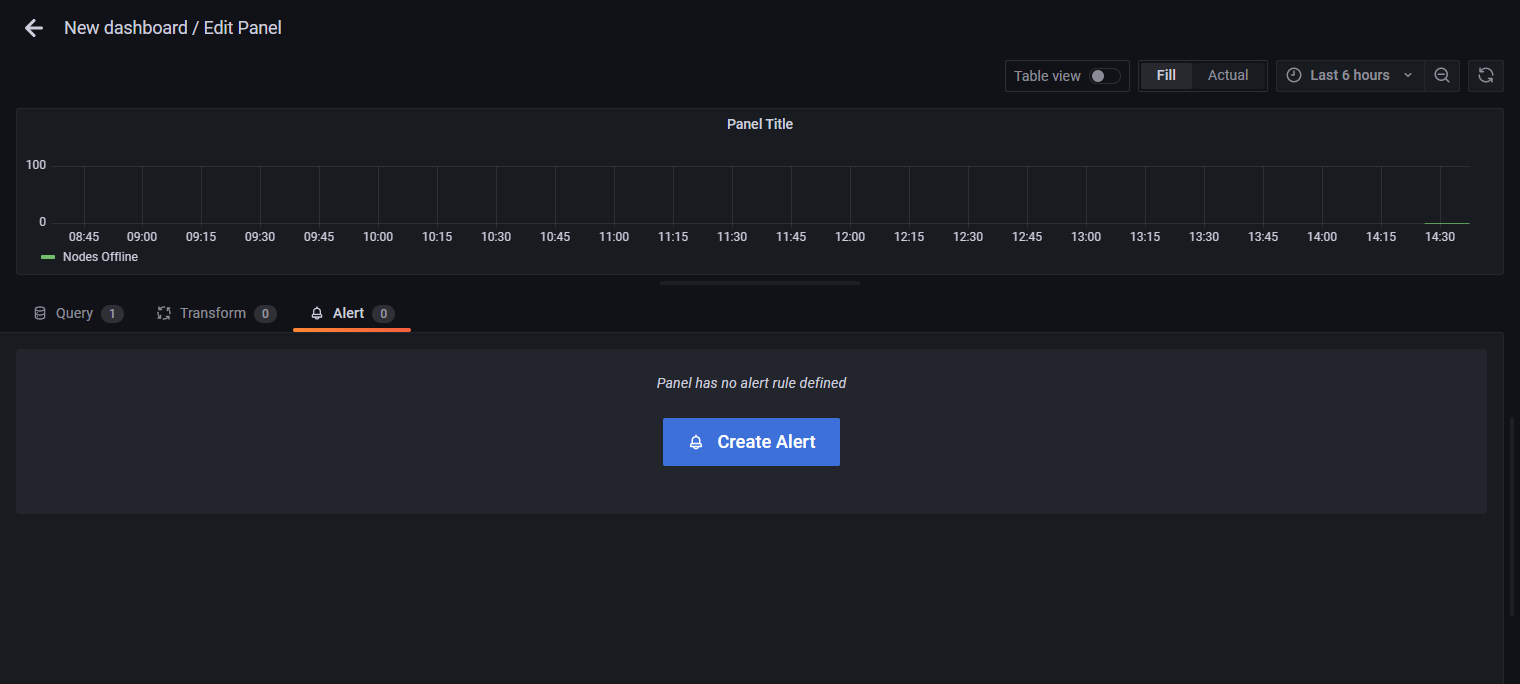 Creating the alert is a bit easier in Grafana because of the GUI that walks you through building a query expression.