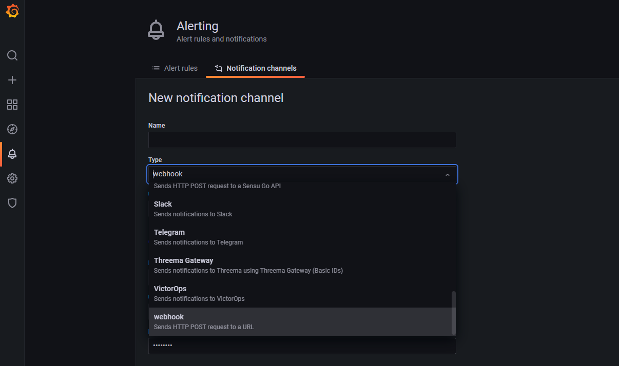 Select the notification target that you want to use from the Type dropdown. There are many options, including PagerDuty, Email, Prometheus/Alertmanager, Slack and webhook. Select webhook from the menu. Webhook is an easy solution when testing because we don’t need an email server or a service account to verify that the notification is triggered.