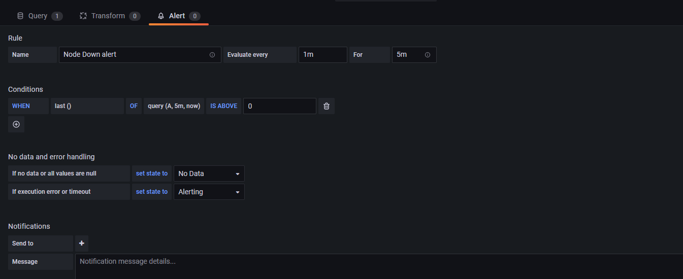Give the alert rule a name if you like. In Conditions, we’re going to build a query that will trigger an alert if the number of nodes offline is greater than 0. We’re also going to configure to send an alert if no data is collected or if the query times out. Then choose Webhook under Notifications, Send to.