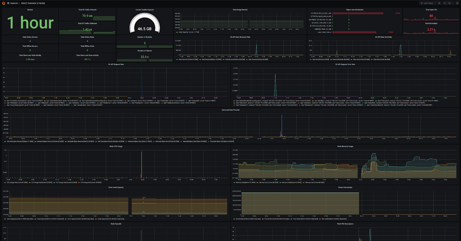 Whether you’re using the MinIO Grafana dashboard or MinIO Console, all the metrics you need to verify optimal performance and availability are at your fingertips.