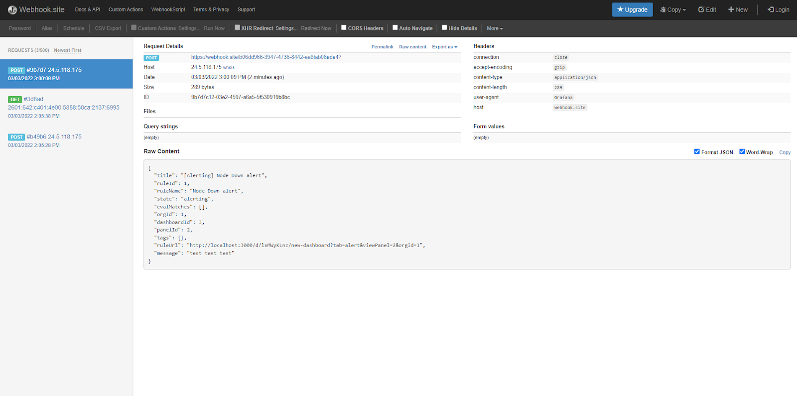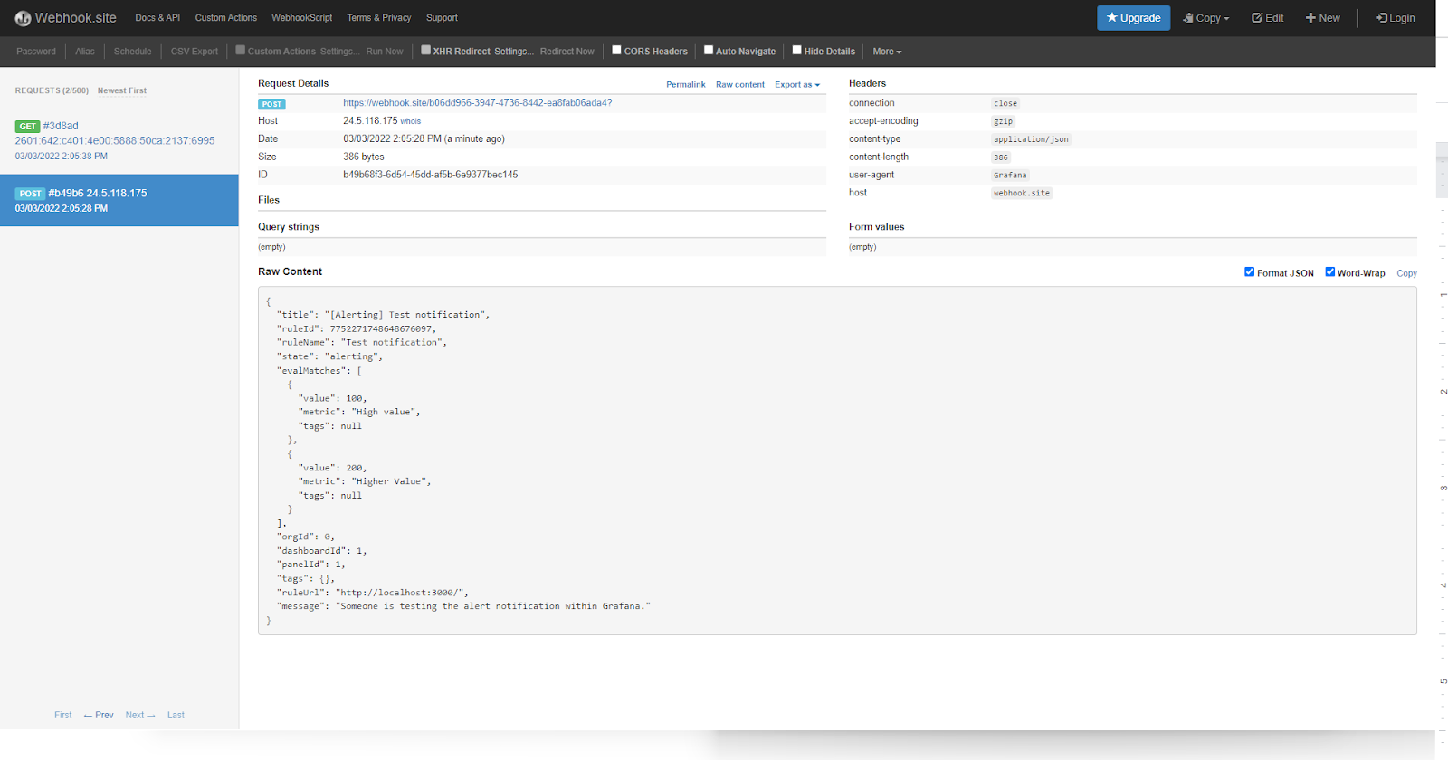 Browse to https://webhook.site. This is a useful tool for quick testing and for viewing the contents of a webhook. Copy your permalink. Go back to Grafana and paste the permalink into the URL field. Then click Test. Return to your webhook.site page to see if the test notification was sent successfully.