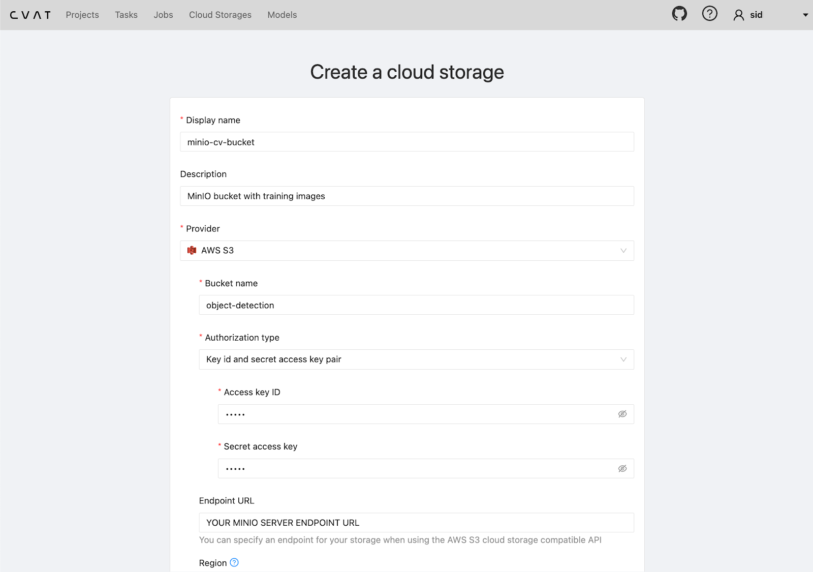 In order to train an object detection model for your use case, a labeled (or ‘annotated’) dataset is needed. A great tool for this is CVAT by OpenCV. A cool feature is that CVAT provides a utility to connect your MinIO bucket as a “cloud storage” in order to feed your bucket’s images directly to the dataset annotation tool. To do this, make sure that your MinIO Server’s host is accessible to the CVAT server, especially if you’re running MinIO Server on-premise or locally on your laptop. Also, as a note, there are two ways to use CVAT: (1) using their provided web app at app.cvat.ai or (2) running it locally. In either case, once you have CVAT open, click on “Cloud Storages” in the menu bar. From there, you can fill out a form to attach your (S3-Compatible) MinIO bucket: