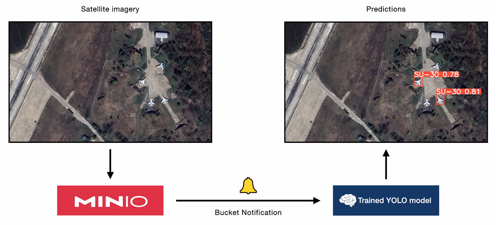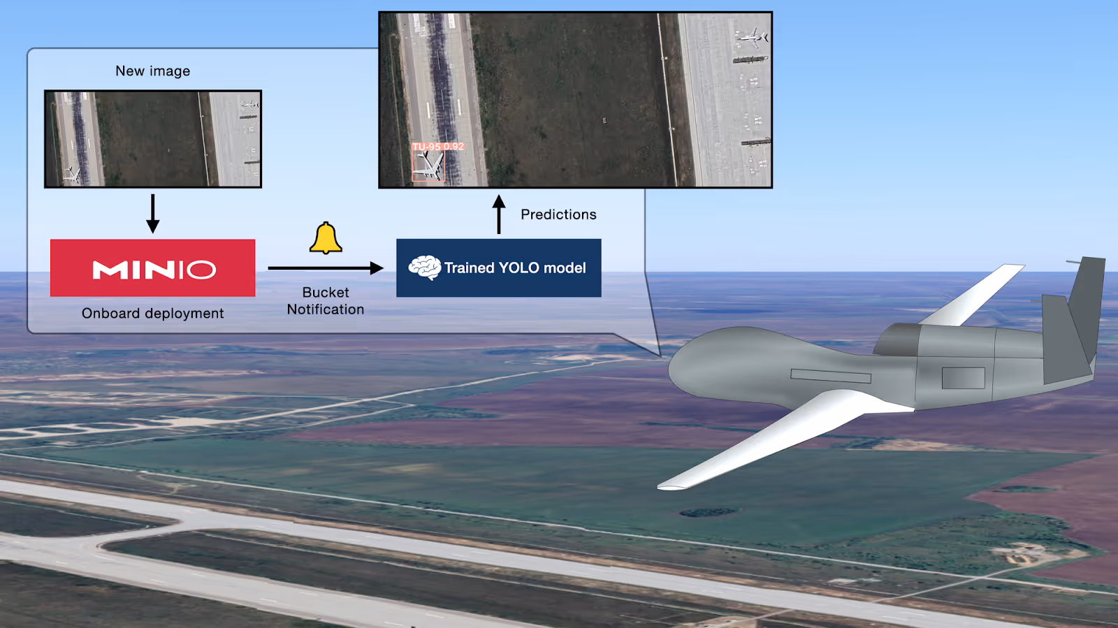Furthermore, for most mission critical applications of computer vision, it is best to conduct inference on the edge. Otherwise, said applications are vulnerable to the latency associated with uploading new data to the public cloud and waiting for an inference server in the cloud to get back with an answer– not to mention the risks of a faulty network connection. For this reason, a computer vision pipeline centered around MinIO as the data layer makes much more sense. Imagine a drone flying over an airfield, being able to capture, store, and use our trained model on new imagery with completely-on-board hardware and software. With a local deployment of MinIO server, the Bucket Notification-based inference system we built at the end of the post works perfectly for this scenario and countless others like it.