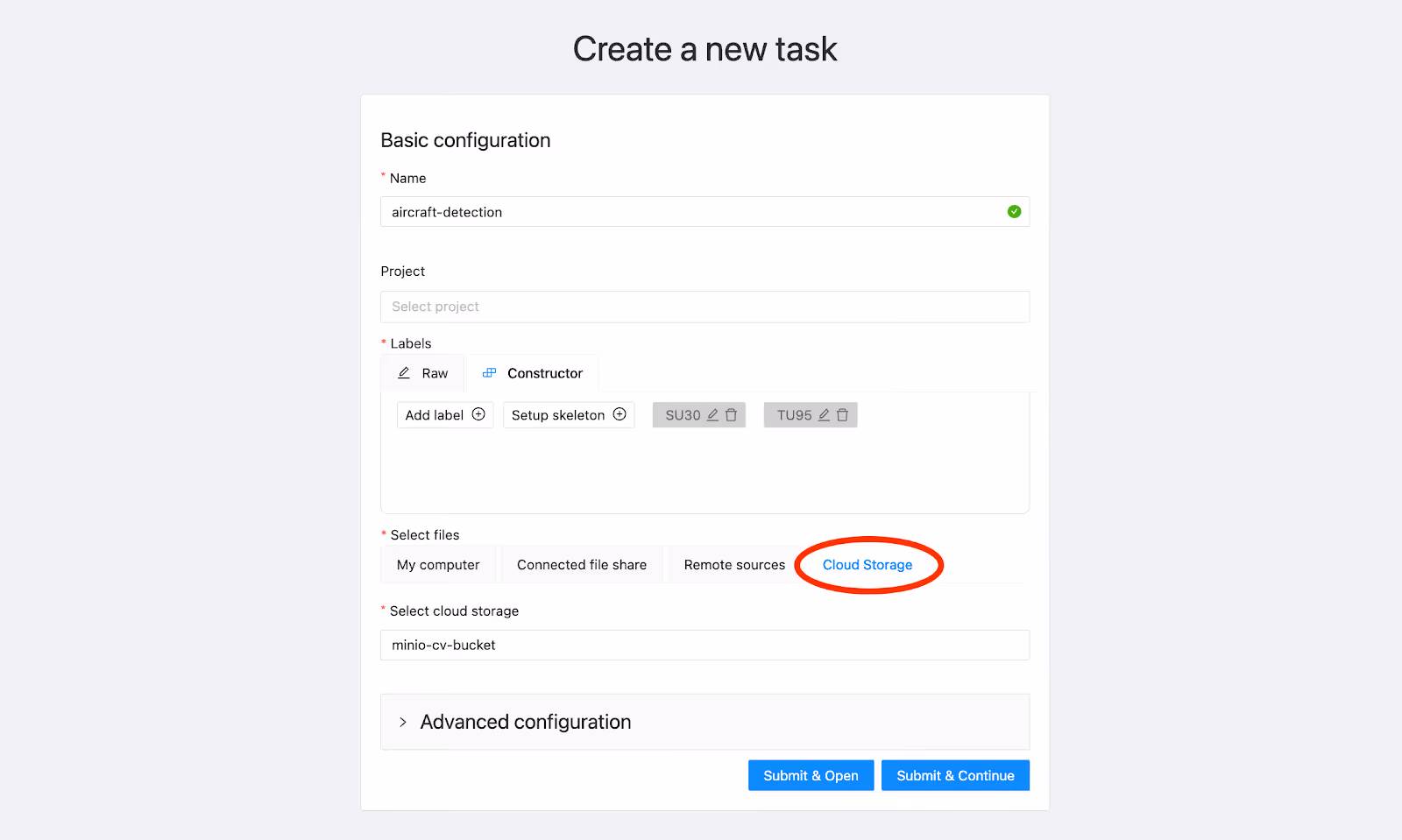 When creating the task, it’s important to define the class labels correctly (I defined two Rectangle labels titled “SU30” and “TU95,” corresponding to the two planes I wanted to detect):