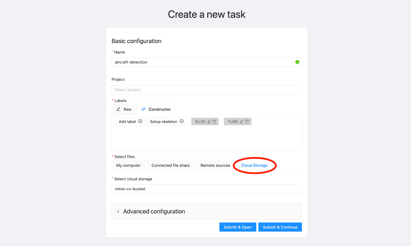 Now the remaining step is to attach our previously added MinIO bucket as a data source. Under “Select Files,” click “Cloud Storage” and fill in the name you provided for that source earlier. I used the name “minio-cv-bucket” above.