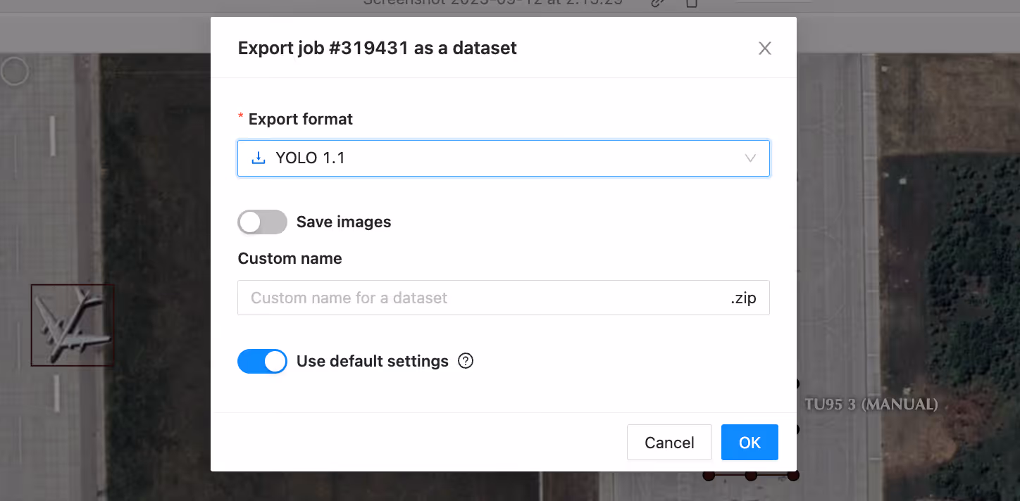 Your exported dataset will be in the form of a zip file. Once you unzip it, the YOLO-formatted annotation text files will be within an enclosed folder. Feel free to take a look at them. In the YOLO format, each image’s annotations are in a text file where each line contains two corners of a bounding box and the class. The class number corresponds to the order in which you defined the labels when creating the task. So, in this example, 0 would correspond to Su-30, and 1 would correspond to Tu-95.