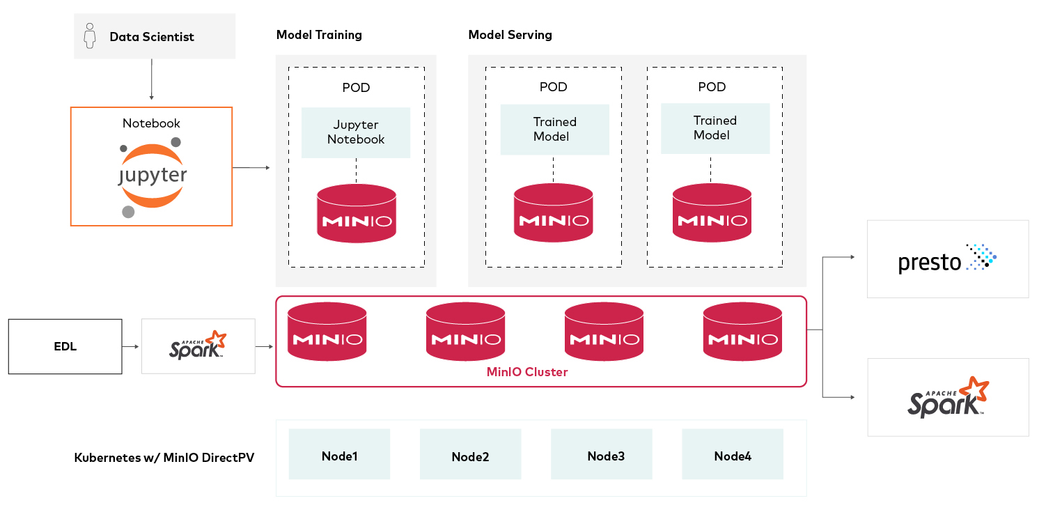 One of the main use cases for on-prem object storage is Enterprise File Handling, where currently over a hundred projects have been migrated to take advantage of the MinIO object store. The bank leverages MinIO for machine learning model training and serving: