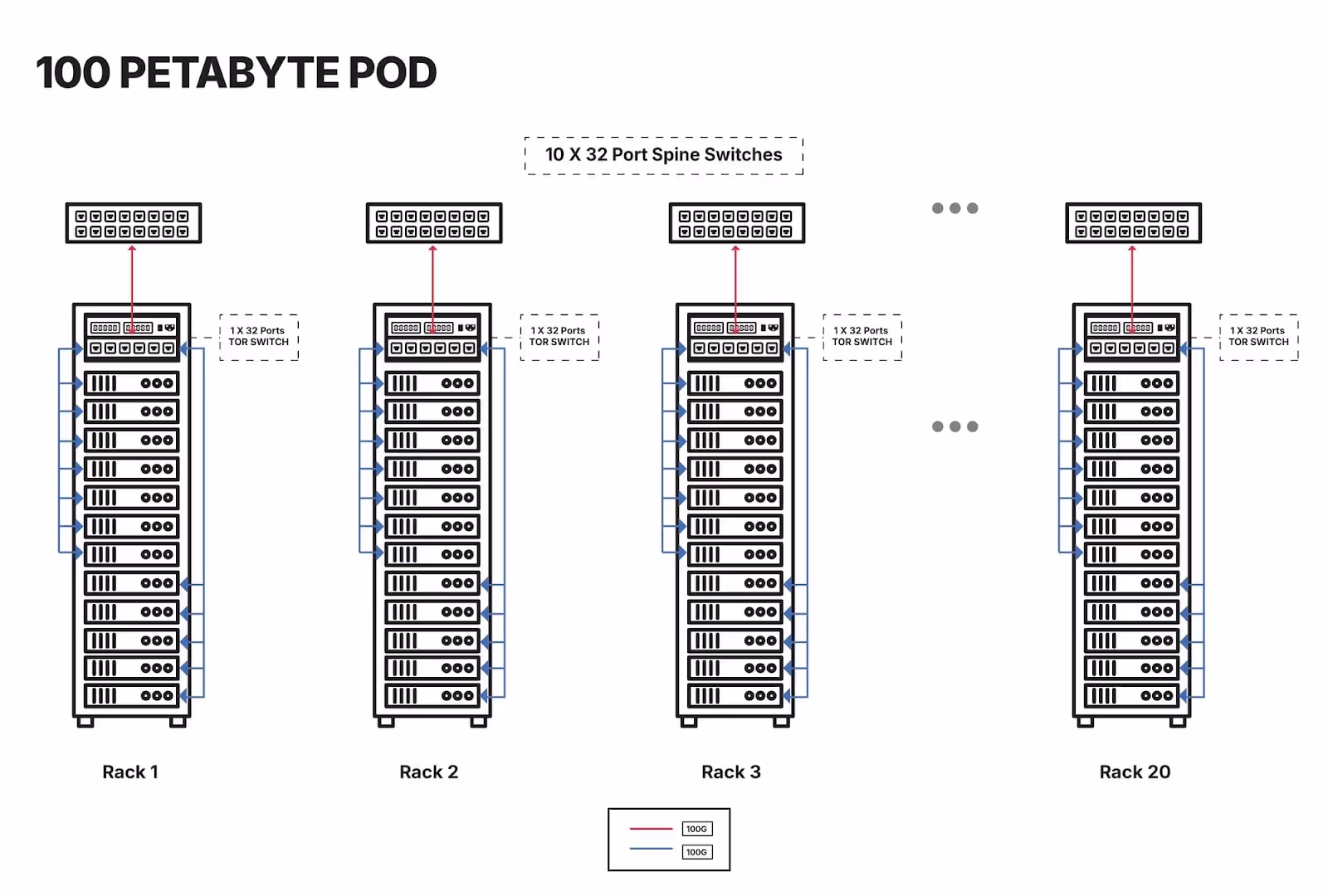 Enterprise customers using MinIO for AI initiatives build exabyte scale data infrastructure as repeatable units of 100PiB. This helps infrastructure administrators ease the process of deployment, maintenance and scaling as the AI data grows exponentially over a period of time. Below is the bill of materials (BOM) for building a 100PiB scale data infrastructure.